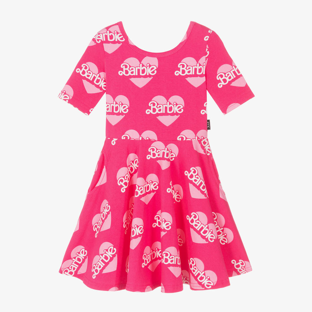 Pretty fuchsia pink dress for girls by Rock Your Baby, in collaboration with Barbie. This skater style is printed with playful Barbie heart motifs across the design, and is made in soft cotton jersey for relaxed comfort.