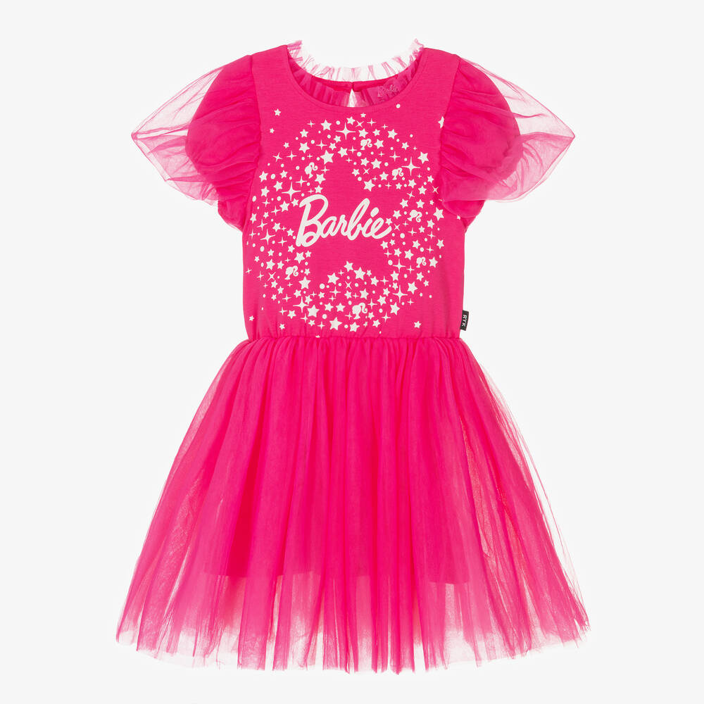 Fuchsia pink tutu dress for girls by Rock Your Baby, in collaboration with Barbie. The jersey bodice has fabulous puffed tulle sleeves, ruffle trims and a twinkling Barbie logo print on the chest. It fastens with a keyhole button on the back of the neck. The voluminous tutu skirt shapes a gorgeous silhouette and is lined in soft cotton jersey for ultimate comfort.
