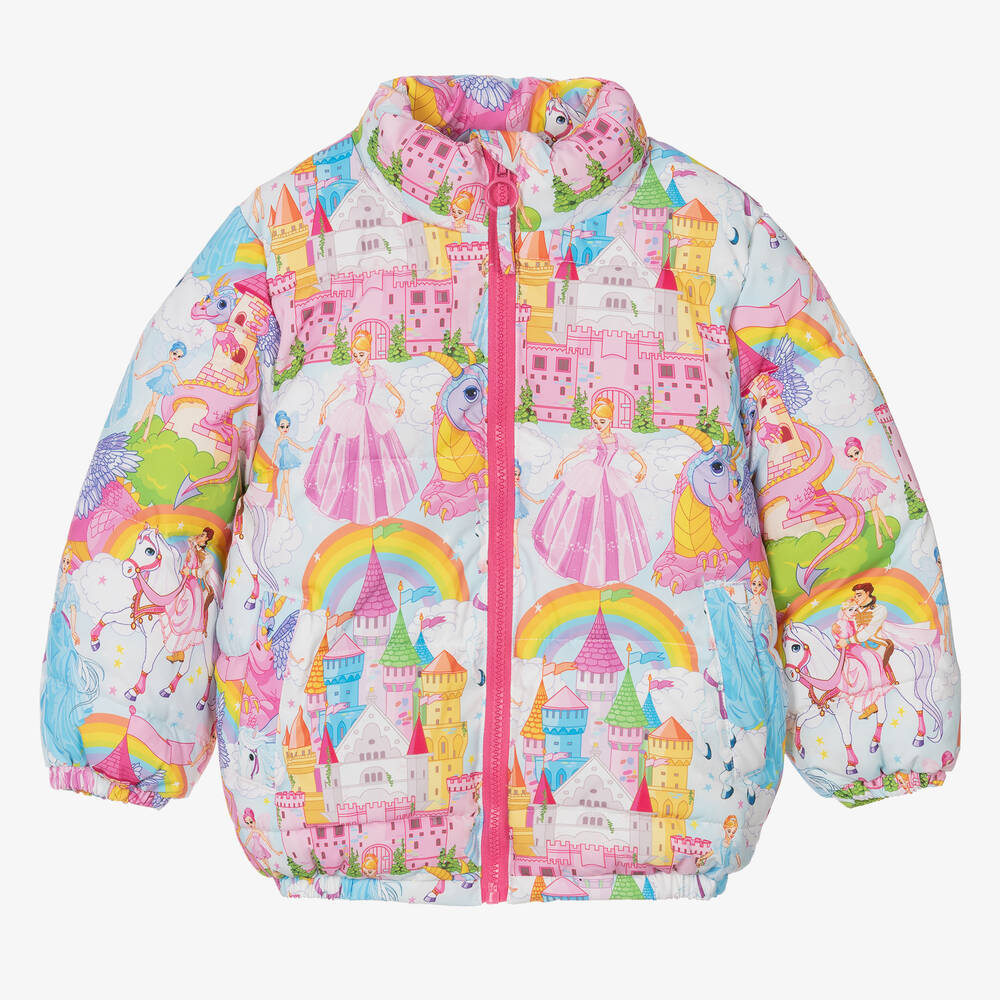 A pink and blue puffer jacket for girls by Rock Your Baby, with elasticated cuffs and hemline to keep the cold out. Soft and mid-weight, this jacket is printed with a 'castles in the air' pattern, featuring princesses, fairies, dragons, and horses. It has a front zip fastening with a protective chin guard and handy slanted pockets on the front.
