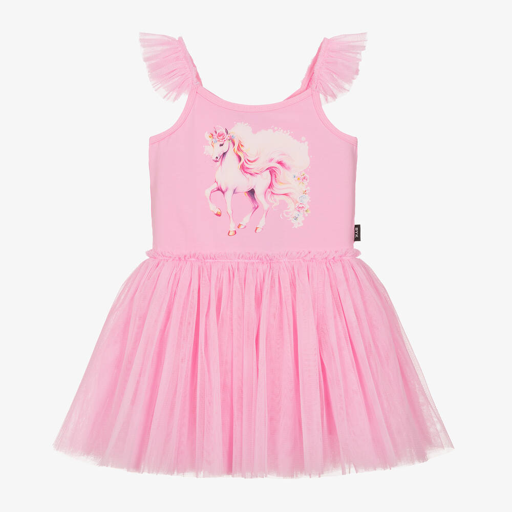 Lovely pink party dress for girls by Rock Your Baby, made in soft and stretchy cotton jersey. The bodice has a gorgeous unicorn printed on the front with tulle trims on the narrow shoulder straps and the pretty skirt is made of layers of soft tulle, ideal for twirling.