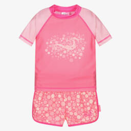 A lovely pale pink tankini for girls by Rock Your Baby, made in a stretchy, crinkle-textured fabric. Lined for comfort, the long-sleeved top has a rounded neckline and the bikini bottoms are gently elasticated for a comfortable fit.