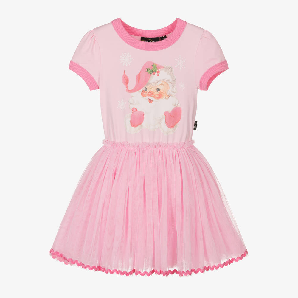 In pretty shades of pink, this festive Rock Your Baby dress for girls has a jolly Santa print on the front. The bodice and underskirt are made in soft cotton jersey, easy to slip on and comfortable to wear. Ideal for twirling, the full, layered tulle skirt has ric rac trim for a pretty finish.