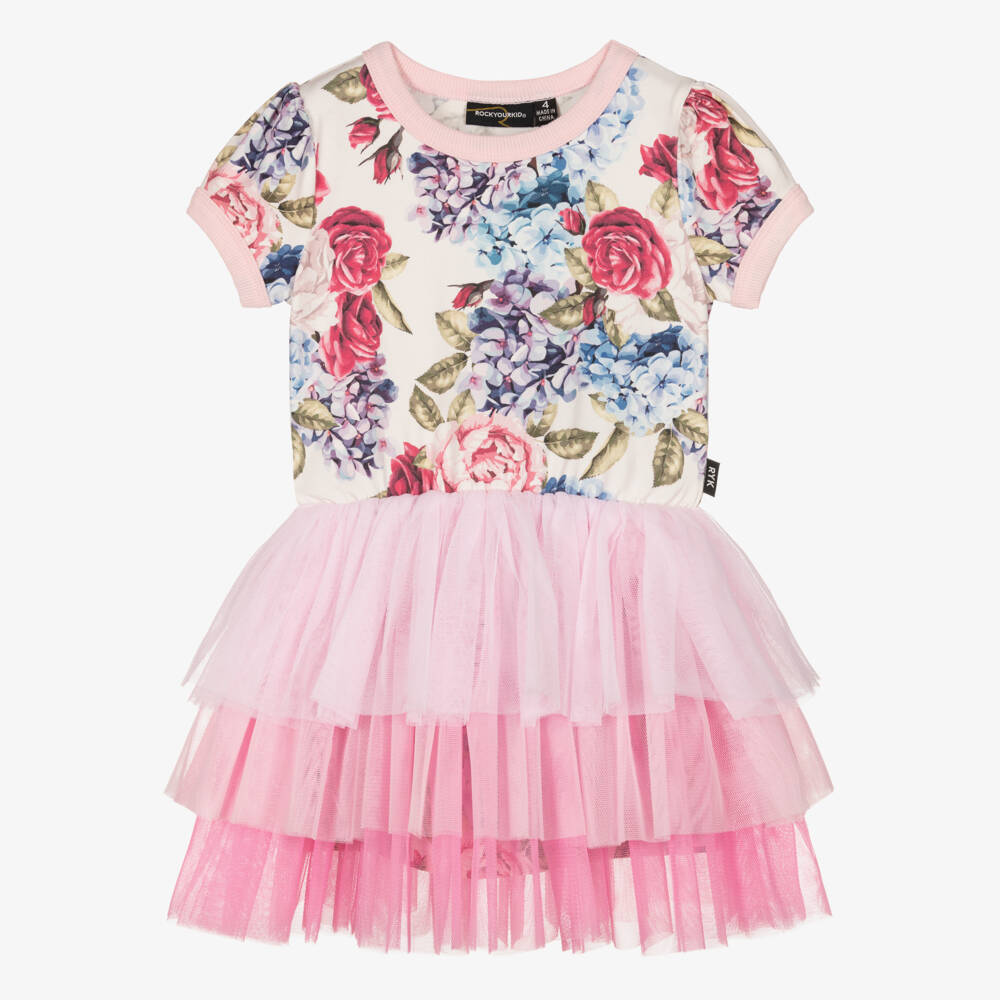 A pretty pink dress for girls by Rock Your Baby, made in soft and stretchy cotton jersey. Great for parties, it has a beautiful floral print in shades of blue, purple and green with girly puff sleeves. The design features a ribbed crew neck and cuffs and a stretchy, elasticated waist for comfort and movement. The layered tulle skirt is styled in a pink ombré effect for a fun finish.