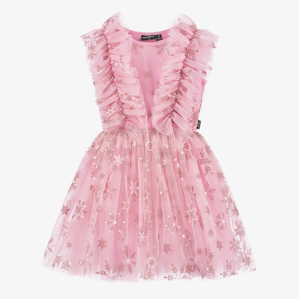 Wonderful pale pink tulle party dress for girls by Australian brand Rock Your Baby, just right for the festive or skiing season. Patterned with glittery pink and white snowflakes, the dress has ruffles over the shoulders and a full, gathered skirt, with lots of tulle layers for extra volume. Lined in soft, comfortable jersey, it is easy to wear, simply pulling on.