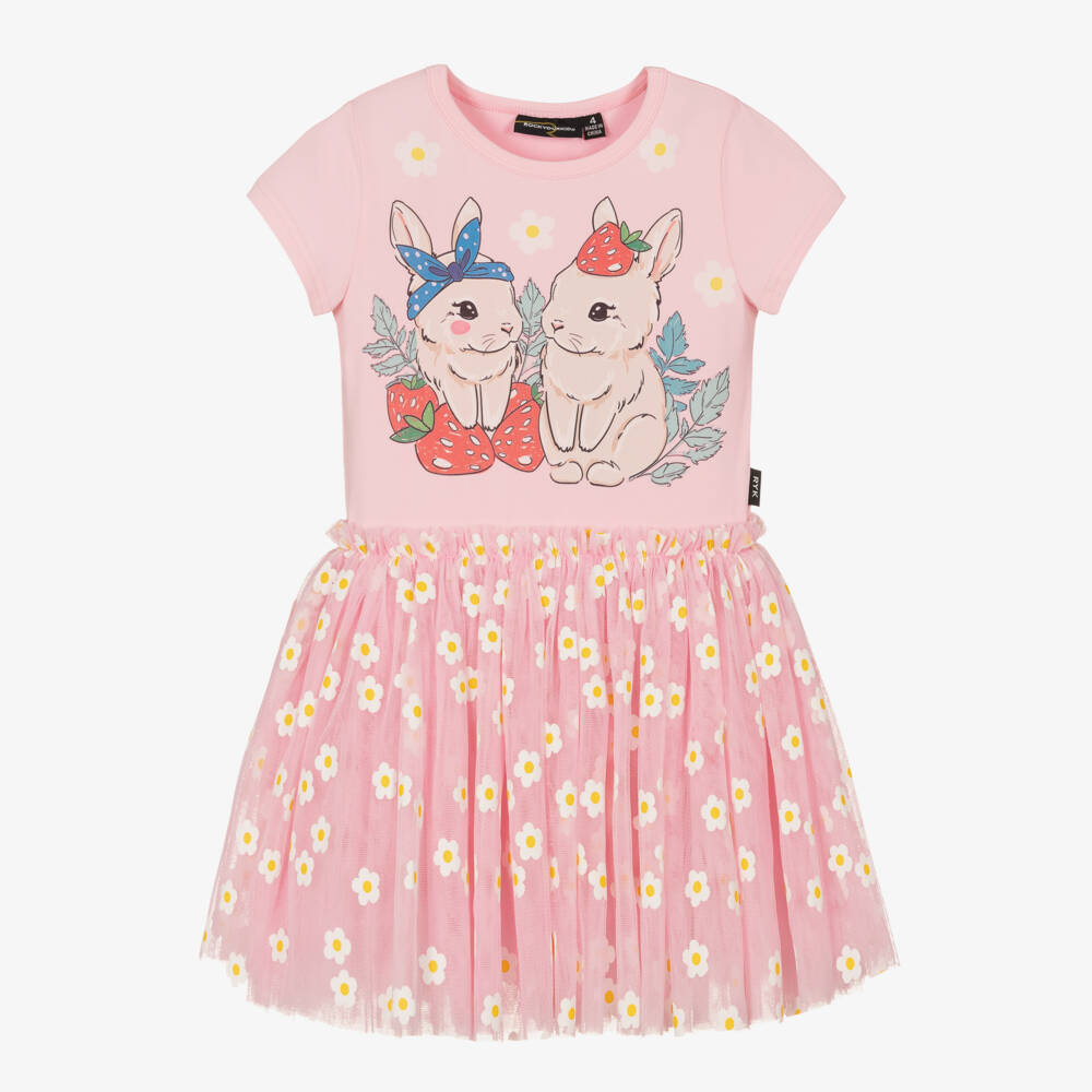 Pretty pink dress for girls by Rock Your Baby, made in soft cotton jersey. The T-shirt style bodice has an adorable bunny motif with sweet daisies. Lined in soft jersey, the fun tutu skirt has a voluminous tulle overlay with cute matching daisies for a girly look.