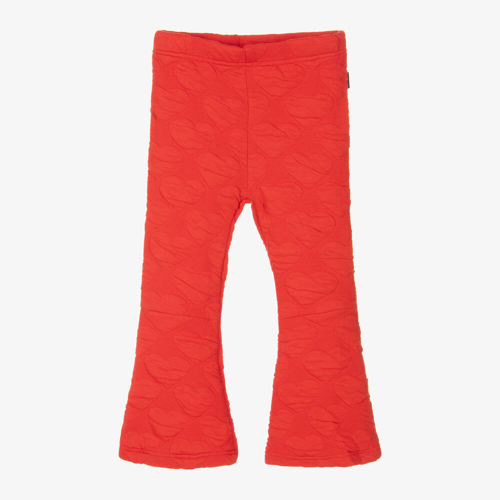 Cool flared red trousers for girls by Rock Your Baby, patterned with quilted jacquard hearts. Super comfortable, they are made in mid-weight cotton-blend jersey with an elasticated waistband. They have a branded pocket on the back.