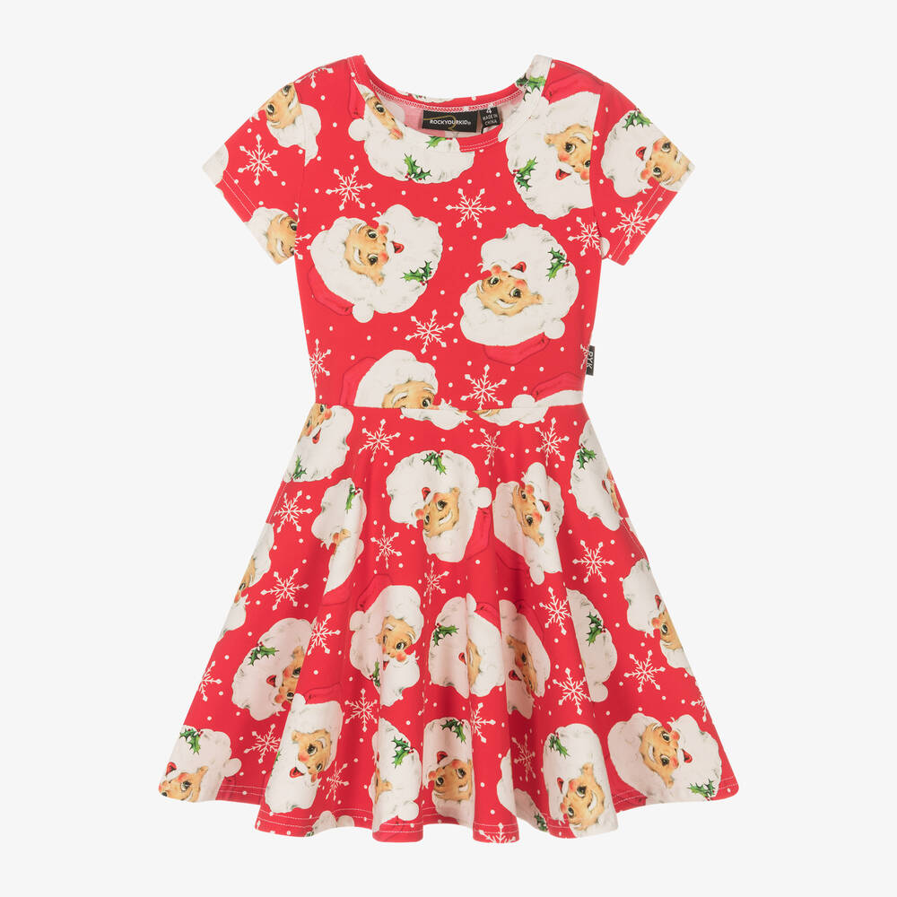 Ideal for festive occasions, this red Rock Your Baby dress for girls is patterned with happy Santa faces and snowflakes. Made in soft and stretchy cotton jersey, this easy slip-on style has a fit and flare design and useful front pockets.