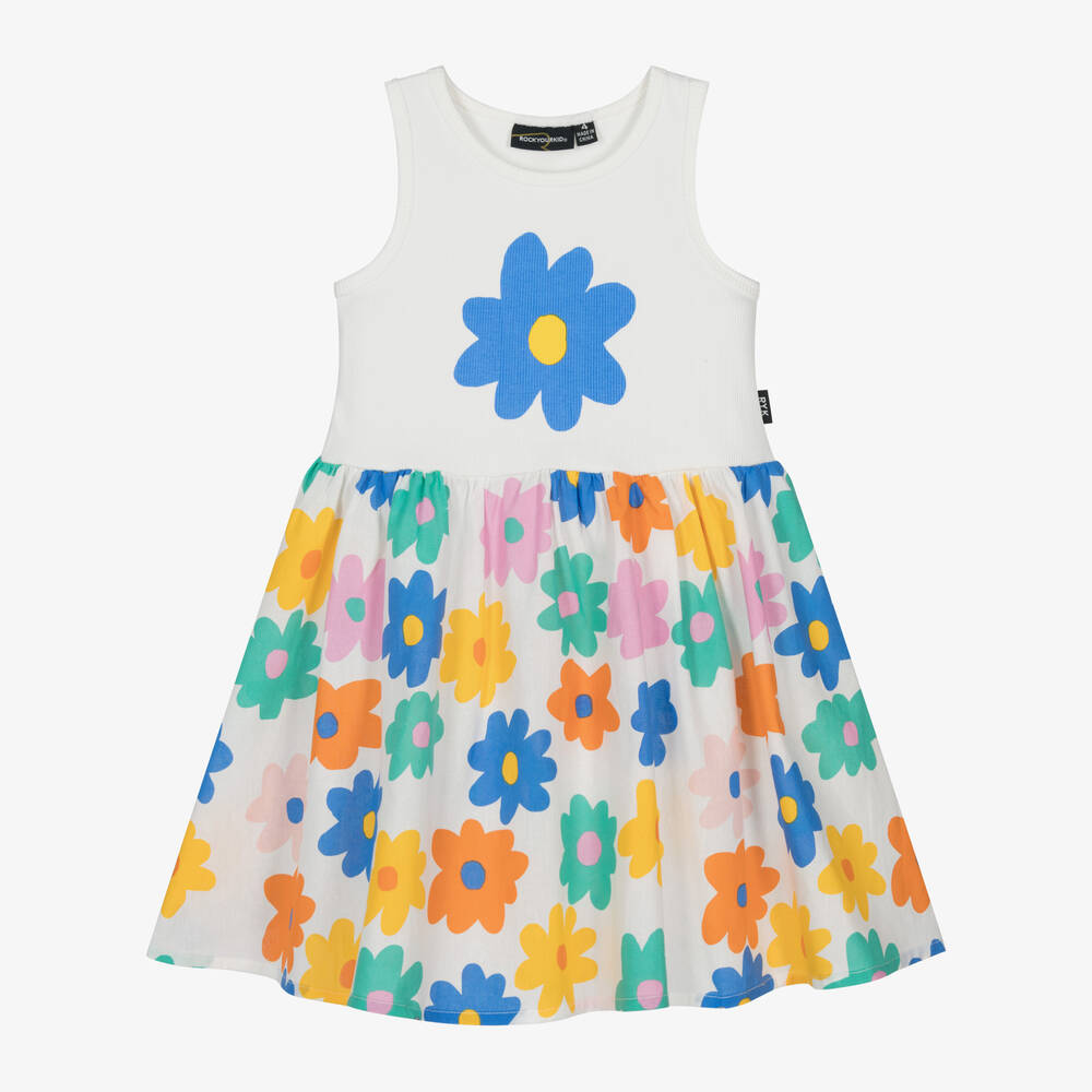 Eye-catching white cotton dress for girls by Australian brand Rock Your Baby. The bodice is made of stretchy jersey with a blue abstract flower print. For flowy movement, the skirt is light poplin and has an all-over flower print in multiple colours for a fun finish.