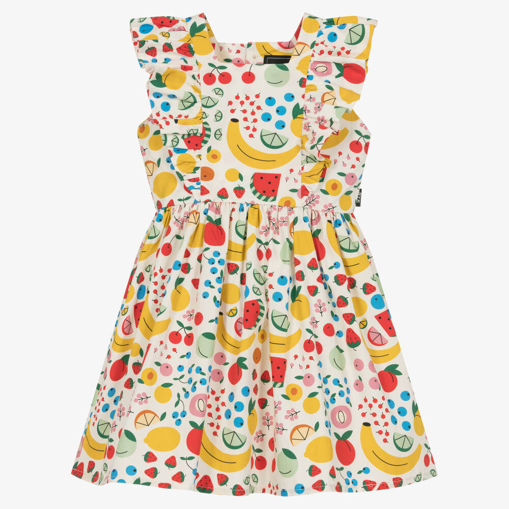 Colourful dress for girls by Rock Your Baby, made in a soft and lightweight cotton weave. Patterned in a fun summer berry and fruit print, it is designed with a full skirt, pretty ruffles over the shoulders and wood effect button fastenings on the front.