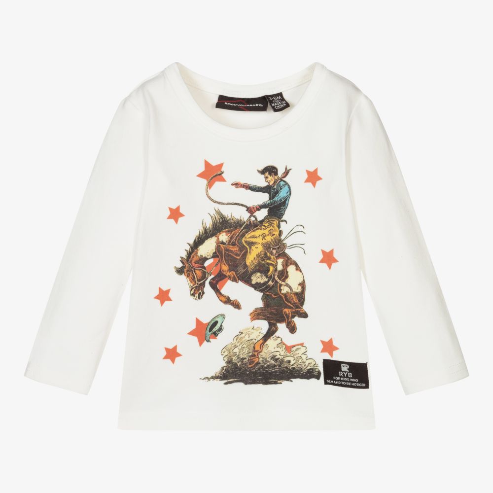 Ivory top for baby boys by Rock Your Baby, made in soft cotton jersey. It has a fun 'Bronco Baby' print in brown and orange on the front.