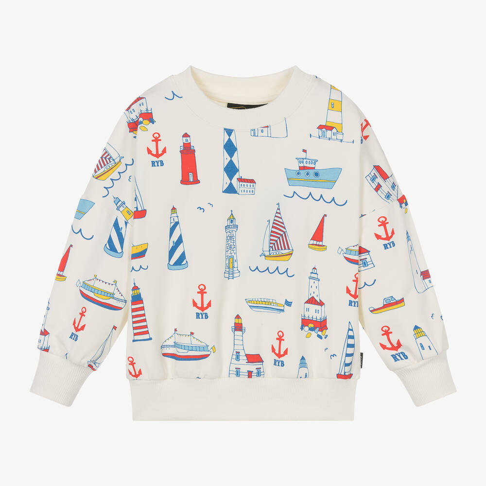 Ivory long-sleeved sweatshirt for boys and girls by Australian brand Rock Your Baby, made in soft, mid-weight cotton jersey. It has cosy ribbed trims and a colourful, nautical-themed pattern, with lighthouse, anchor and sailing boat prints.