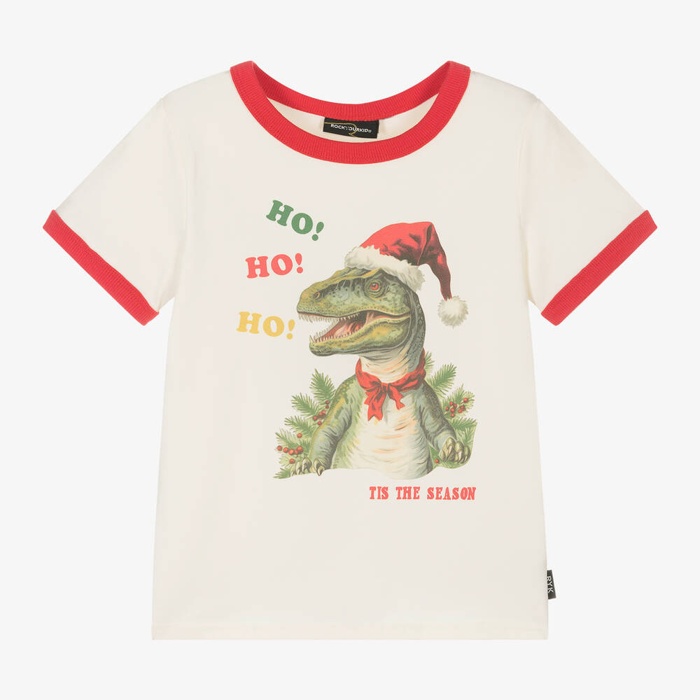 A fun ivory T-shirt for boys and girls by Rock Your Baby, with a festive dinosaur print on the front. Made in soft cotton jersey, it has a retro ringer design with contrasting red ribbed trim.