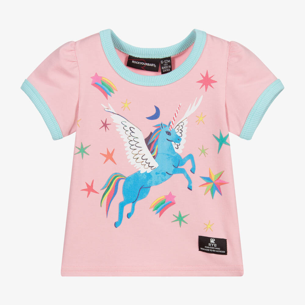 Pink T-shirt for baby girls by Rock Your Baby, made in soft cotton jersey. It has turquoise blue trims and a colourful rainbow Pegasus print on the front.