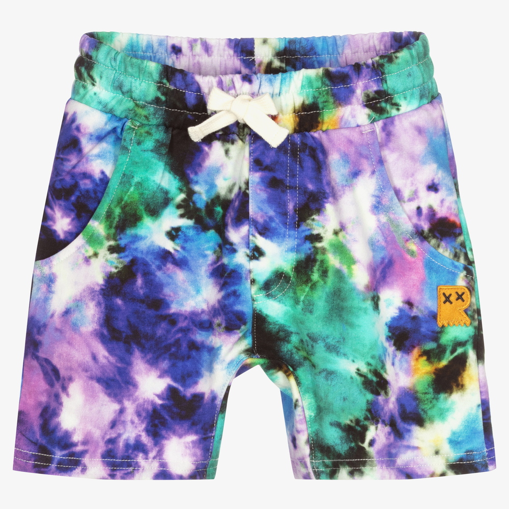 Boys blue, green and purple T-shirt from Rock Your Baby, with an eye-catching 'Festival Tie Dye' pattern. It is made in mid-weight cotton jersey, with three pockets and a drawstring waistband. There is a yellow logo patch on the front and a black logo patch on the back.