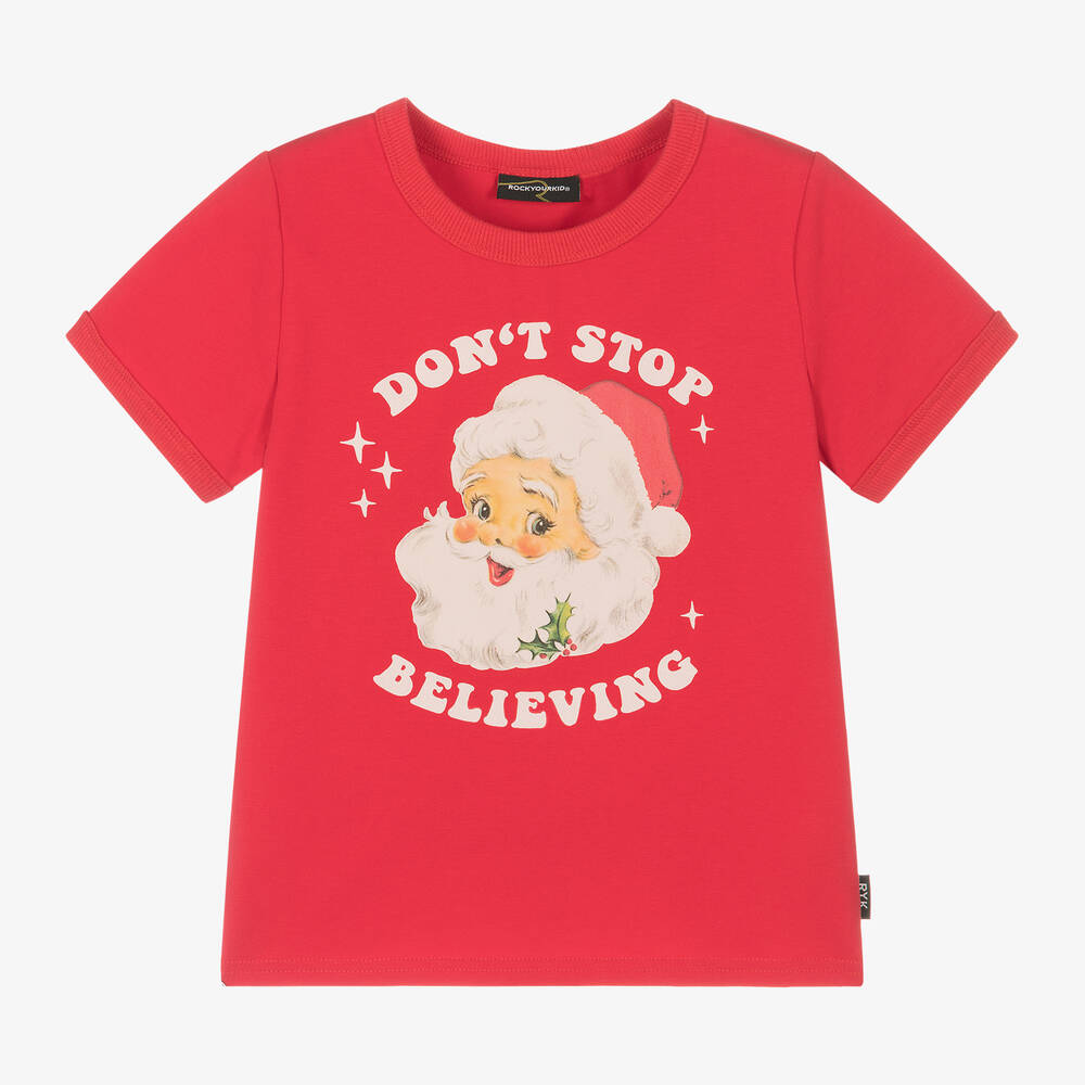 A festive red T-shirt for boys and girls by Rock Your Baby, featuring a fun Santa face and the words, 'Don't Stop Believing'. It is made in soft cotton jersey with short sleeves and ribbed trims.