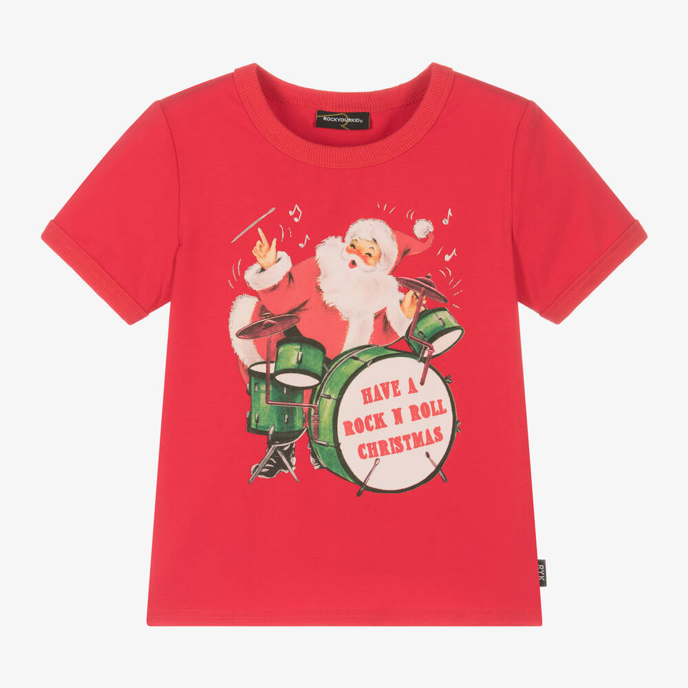 A fun drumming Santa decorates the front of this red Rock Your Baby T-shirt for boys and girls. Made in soft and comfortable cotton jersey, this fun, festive design is printed with the words, 'Have a Rock N Roll Christmas'.