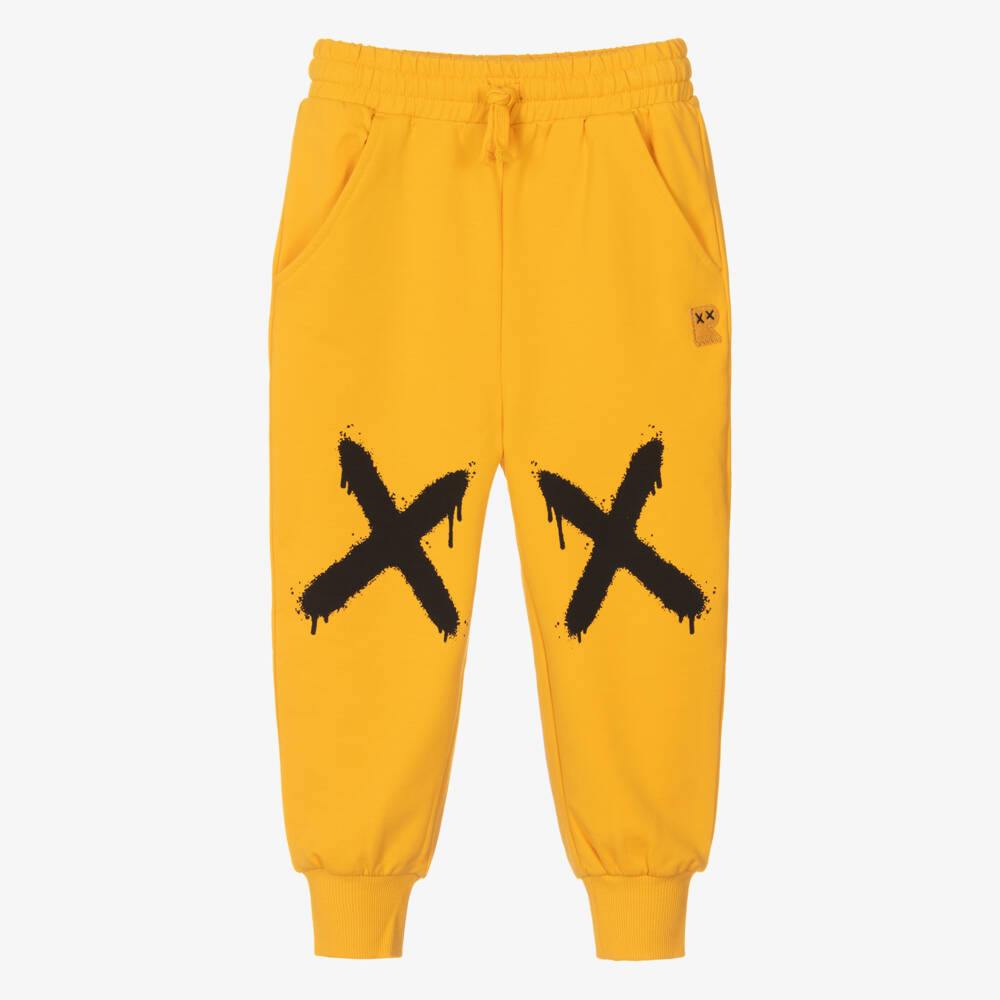 Fun yellow joggers for boys and girls by Rock Your Baby, printed with a cool graffiti motif on each leg. They are made in mid-weight cotton jersey and have ribbed ankle cuffs for a cosy feel. There is an elasticated drawstring waist for an ideal fit, with useful slanted pockets on the front.