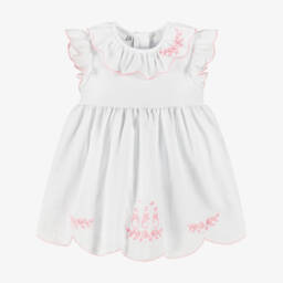 A beautiful white dress set for baby girls by Romano, designed with special occasions and ceremonies in mind. There are appliqué flower embellishments on the neckline and the empire waistline, and the organza outer layer of the full skirt is embroidered with flowers and sequins. Lightweight and floaty, the coordinating organza jacket has a sweet collar and pretty floral detailing with tiny faux pearl beads. An adorable bonnet with a comfortable elasticated strap completes the look.