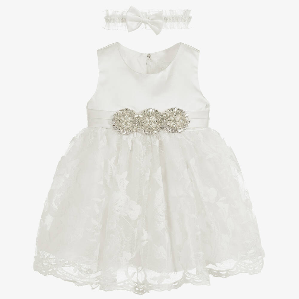 A soft ivory tulle dress set for baby girls by Romano Princess. This pretty sleeveless dress has an elegant lace overlay and layers of netting to give it a princess shape. It is fully lined in silky fabric for comfort and fastens on the back with a concealed zip and clasp.