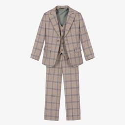 A smart bright blue Romano suit, with white pinstripes. It is made in a soft viscose blend and beautifully tailored. The jacket has a copper-coloured silky lining, patterned in navy blue jacquard dots to match the back of the waistcoat, with useful internal pockets. The coordinating trousers fasten with a button, zip, hook and eye.