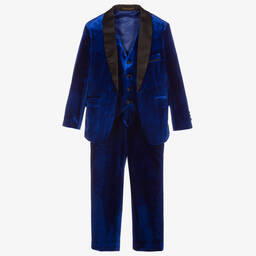 A smart bright blue Romano suit, with white pinstripes. It is made in a soft viscose blend and beautifully tailored. The jacket has a copper-coloured silky lining, patterned in navy blue jacquard dots to match the back of the waistcoat, with useful internal pockets. The coordinating trousers fasten with a button, zip, hook and eye.