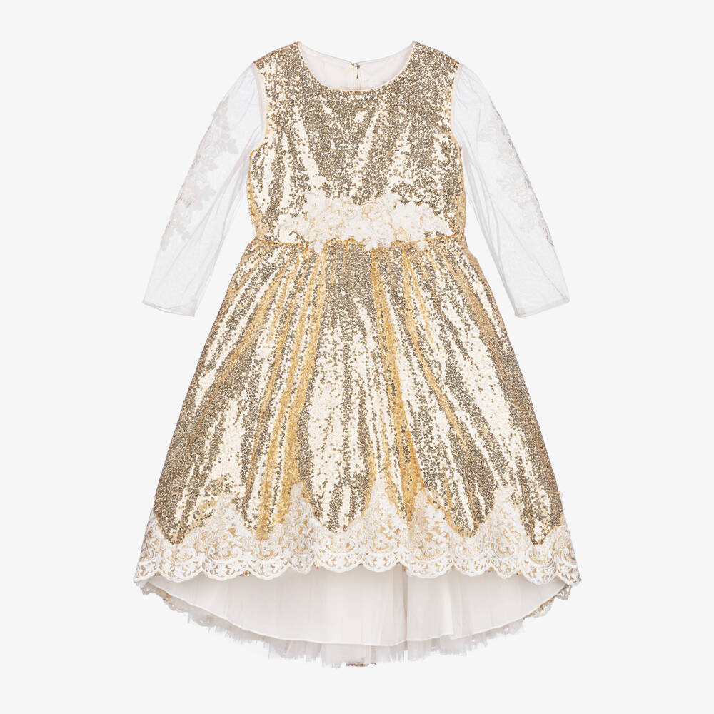 Dazzle in this gorgeous gold dress for girls by Romano, made from glittery sequin-covered tulle. It has beautiful ivory appliqué floral lace trims on the waist, around the dramatic high-low hem, and on the sheer ivory three-quarter-length sleeves. Lined in soft satin, it has tulle underlayers for extra volume and fastens with a concealed zip and ribbon ties on the back.