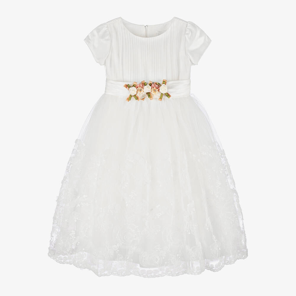 A delightful ivory special occasion dress for girls by Romano. Sweet and pretty, the soft satin bodice has a lovely pleated tulle overlayer and short sleeves. The beautiful lace skirt has silky soft lining and underlayers of tulle netting for added volume. Fastening with a concealed zip, it has a charming flower and diamanté embellished satin belt that ties neatly on the back.