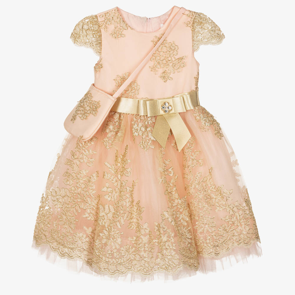A lovely pink and gold dress set for girls by Romano. Made from beautiful gold embroidered lace with pretty capped sleeves, this dress has underlayers of tulle for extra volume. Fastening with a concealed zip, the attached gold sash with a sparkling jewelled bow embellishment ties neatly on the back. Smaller sizes come with a frilled headband, and larger sizes come with a coordinating bag.
