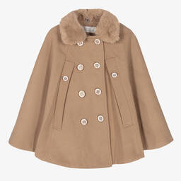 Smart red cape for girls by Romano, with a detachable faux fur collar. It has a soft felted feel and a silky satin lining. It fastens with decorative ivory and gold crest buttons and has matching buttons on the arm openings.