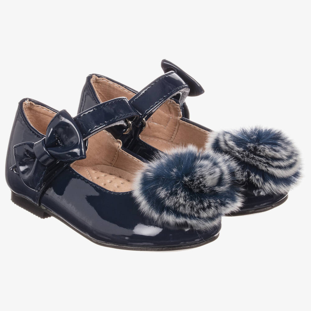 Girls patent navy blue shoes by Romano Princess, made in faux leather with a padded instep on the insole. They have a large fur pom-pom on the front and sweet bow on the velcro straps.
