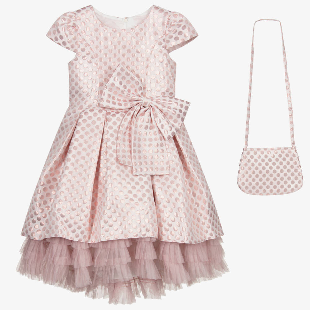 Girls stunning special occasion dress and bag set in a pink polka dot jacquard by Romano. The dress has a bow on the front and a sash to tie on the back. The hem has tiers of pleated pink soft tulle with longer length at the back. It has a silky lining, trimmed with stiff netting for a fuller look. The matching shoulder bag completed the look.
