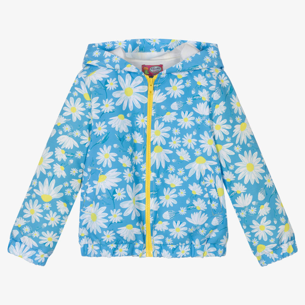 Lovely blue zip-up jacket for girls by Rosalita Senoritas, lined in luxuriously soft cotton jersey for comfort. Patterned with a bright all-over daisy print, it has a cute yellow zip fastening on the front and cuffed trims to keep in warmth. With slanted front pockets, it has a useful fixed hood.