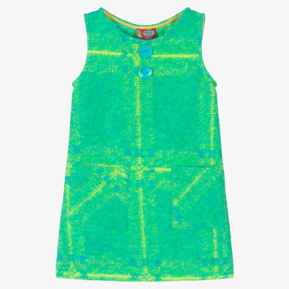 Striking green and yellow pinafore dress for girls by Rosalita Señoritas, with a classic, 60's A-line silhouette. Soft and mid-weight, this unlined dress slips on easily over the head. There are two handy patch pockets on the front and decorative blue buttons for a fun look.
