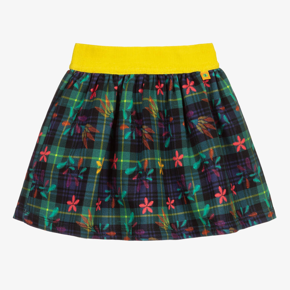 Girls skater skirt by Rosalita Senoritas, made in cotton jersey. It has a navy blue and green tartan with a delicate floral pattern and has an elasticated yellow waistband for pull-on wear.