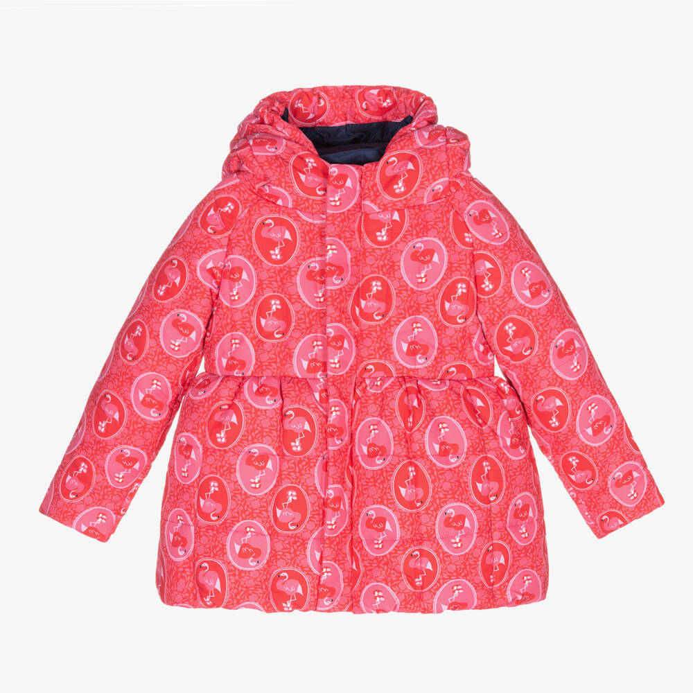 A gorgeous bright pink hooded puffer coat for girls by Rosalita Senoritas. Warmly padded, it has an eye-catching pink flamingo pattern and a navy blue satin lining. The coat is slightly gathered at the waist, creating a flared silhouette. It fastens with a zip and has useful pockets on the front.