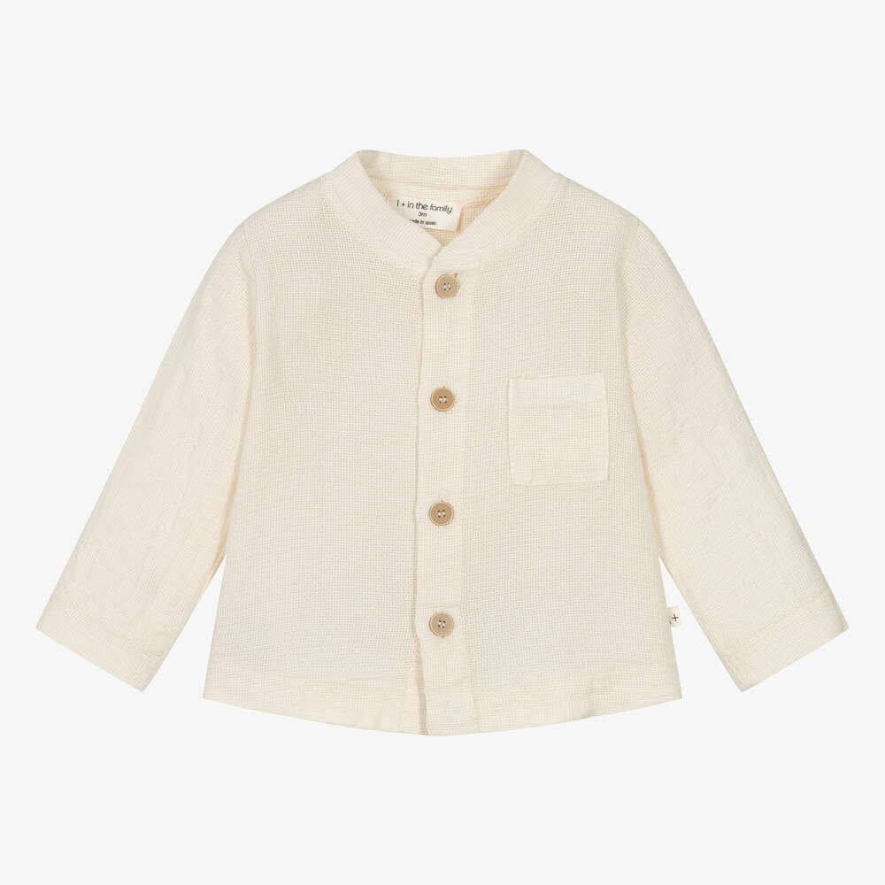 An ivory cotton shirt for younger boys from 1 + in the family, made in a soft, textured weave. Cool and comfortable, it has a ribbed collar and long sleeves, with a sweet patch pocket on the chest. Button fastenings on the front add a neat finish.
