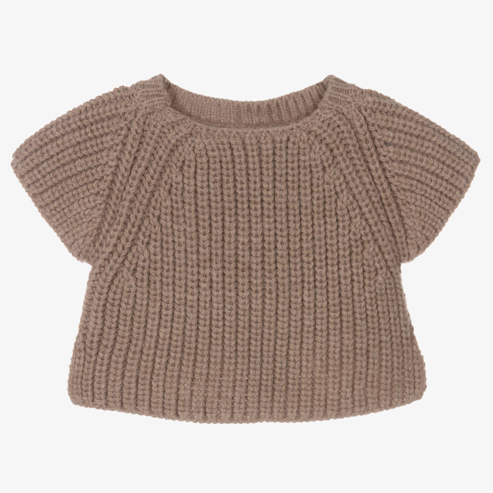 Lovely for little girls, this taupe brown jumper by 1 + in the family is knitted in a soft alpaca wool blend. Ideal for layering, this chunky ribbed knit top has short sleeves and a split hem.