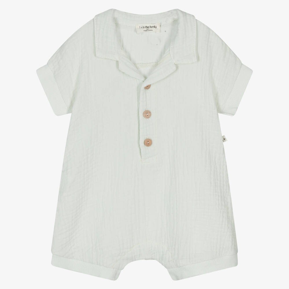 Green cotton shortie for baby boys and girls from 1 + in the family, made from soft, lightweight muslin offering breathability and comfort. This charming piece features a revere collar, wooden buttons, and short sleeves, making it ideal for warm weather. The style is complete with soft ribbed trims and popper fastenings between the legs for easy changing.