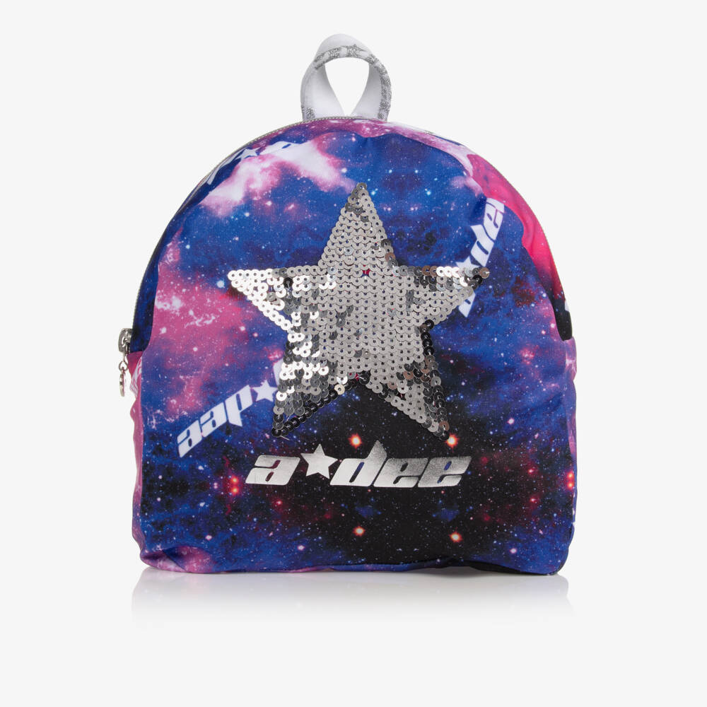 Cool pink and blue backpack for girls by A Dee. Made in silky jersey, it features a pretty galaxy design with a silver logo print and a star in silver sequins. A lovely item to complete an outfit, it has a jersey lining, a spacious inner compartment and a silver zip fastening. The stretchy, adjustable shoulder straps have glitter logo prints.