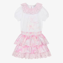Stand out in this skirt set for girls by A Dee, including an off-white top and red sequined skirt. Made from soft cotton jersey, the top has long puffed sleeves, a branded diamanté crown design on the chest, and a keyhole button fastening on the back. Super sparkly, the tiered skirt is lined in silky satin and has layers of tulle for extra volume. There is a red and gold striped stretchy waistband to ensure a comfortable fit.