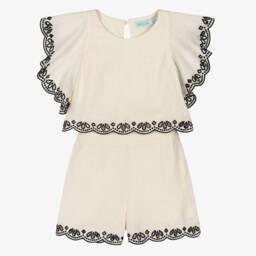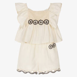 Smart pink shorts set for girls by Abel & Lula, made from soft tweed woven with glittery gold thread and stylish fringing. Offering classic charm with a modern twist, the layered-effect top has contrasting ivory sleeves and collar in lightweight, crinkly crêpe. The matching shorts have front pockets with decorative gold buttons on the front patch pockets and an adjustable waistband for a comfortable fit.