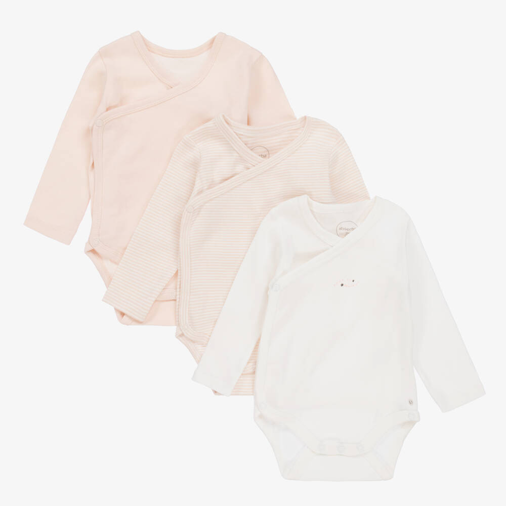 Pack of three cotton bodyvests for baby girls by classic French brand Absorba. Made in comfortable jersey, they all have easy-to-use popper fastenings on the wrap-over front and between the legs. One is pale pink, one is striped in pale pink and white, whilst the other is white with 'very softly' in French printed on the front in pale pink.