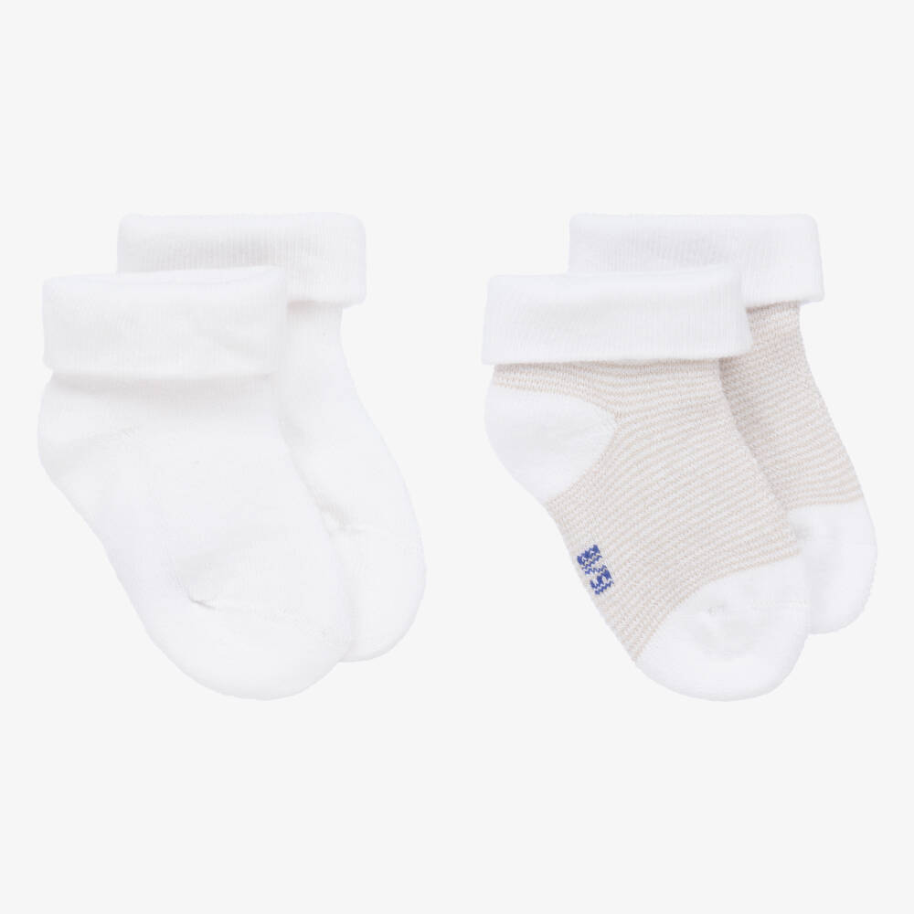 Two pairs of white socks for baby boys and girls by Absorba, made in a soft and stretchy cotton blend. One pair is plain white and the other pair has a delicate beige and white striped pattern with white trims. Both pairs have an embroidered red heart on the cuffs and warm, cosy towelling on the inside.