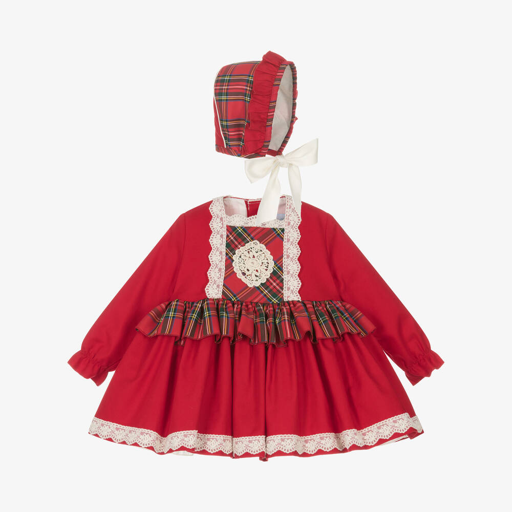 Red cotton dress set for baby girls by Abuela Tata. Made in soft twill, the charming dress has a tartan panel on the bodice, with a matching ruffle on the full skirt. It is trimmed with delicate, ivory lace and has a soft tulle sash on the back that ties into a pretty bow. Lined in a soft cotton blend for comfort, the dress fastens with pearlescent buttons on the back. To complete the traditional look, it comes with a pair of matching knickers and a frilled bonnet with satin ribbons to secure under the chin.