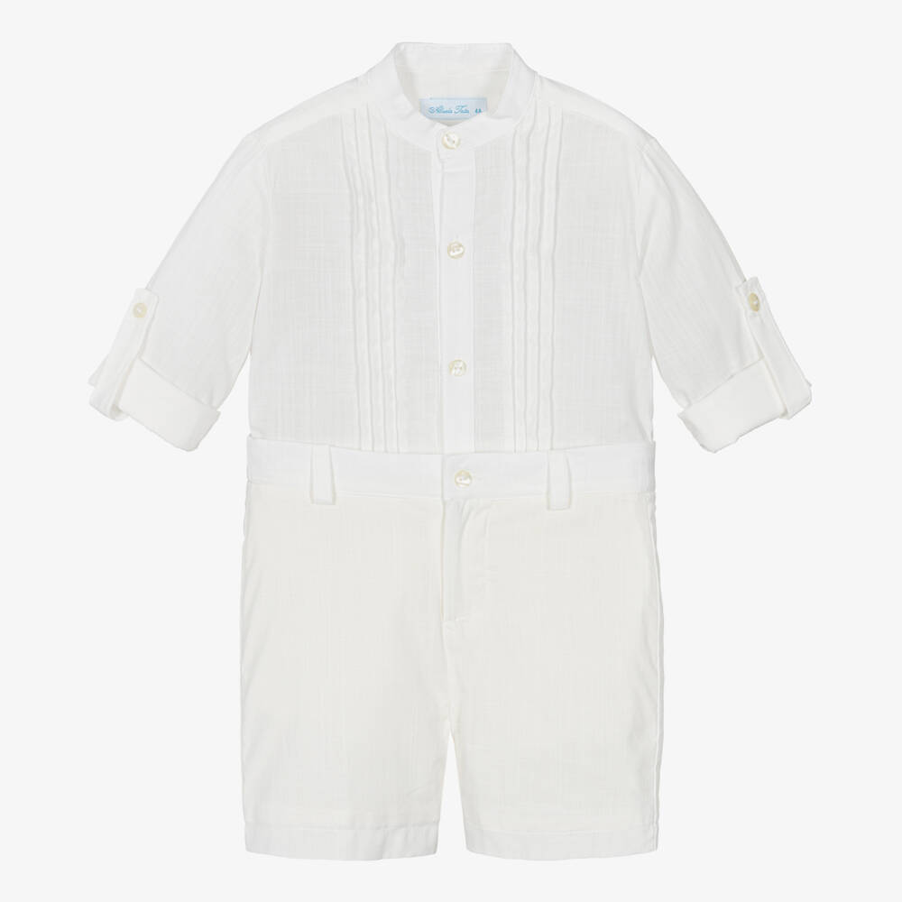 A smart ivory shorts set for boys by Spanish brand Abuela Tata, woven in soft cotton that has a classic linen look. The shirt has a stylish Mandarin collar, elegant pintucks down the front, and a useful button tab on the sleeve. It fastens with pearlescent buttons down the front. The shorts have n adjustable waist for a comfortable fit, securing with a zip and button on the front.