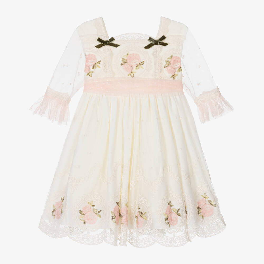 A classic ivory dress for girls by Spanish brand Abuela Tata, made in a soft, mid-weight cotton blend with a delicate tulle overlay. Lovely for a special occasion, it has sheer three-quarter-length sleeves with cotton lace detailing and a pink tulle trim on the cuff. The bodice is beautifully embroidered with pink roses and detailed with green velvet bows on the neckline. Identical, vintage-style patterning can also be seen on the skirt and hem. Fully lined for a fuller look, this charming dress is finished with pearlescent buttons and a detachable spotted bow sash on the back of the waistline.