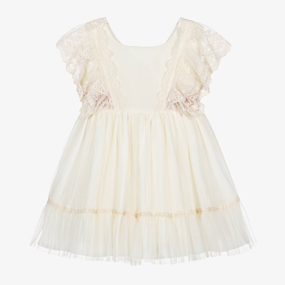 A beautiful ivory dress for girls by Spanish brand Abuela Tata, made from a soft, mid-weight cotton blend with a lovely tulle overlay. Traditionally styled, this round neck dress has sheer, lace sleeves with decorative floral embroidery and a scalloped edge. Identical patterning can be seen on the bodice and around the ruffled hem for a vintage flair. There are two pearlescent button fastenings and a bow sash on the back in a pretty shade of pink. It is lined with a mid-weight cotton blend for both a fuller look and a comfortable feel against the skin.