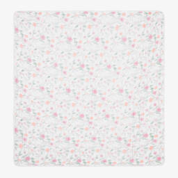 Lovely white muslin blanket for baby girls by aden + anais, woven in beautifully soft and lightweight cotton. One side is printed with cute bunnies and the other side has a pink flower print. Becoming softer with each wash, it is ideal for newborn tummy time and cuddles.