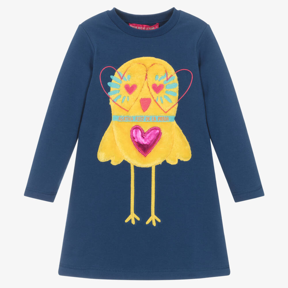 Navy blue cotton sweatshirt dress for girls by Agatha Ruiz de la Prada. This cosy dress has a soft, fleecy inside, a casual ribbed crew neck and simply pulls on over the head. An eye-catching fluffy yellow chick motif is on the front, detailed with cute hearts and the brand's logo for a fun, designer finish.