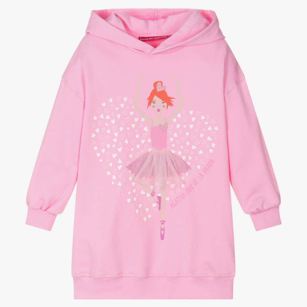 Lovely pink hooded dress for girls by Agatha Ruiz de la Prada, made in a soft cotton sweatshirt jersey. Great for stylish casual wear, it is soft and fleecy inside and has stretchy ribbed trims. There is a gorgeous ballerina logo motif on the front, wearing a glittery tulle tutu, surrounded by sweet white hearts.